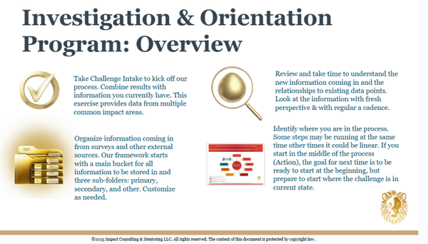 This product is focused on gathering information, creating a process to manage the information, & identifying "where you are" in your challenge to get oriented. This can be used for personal or professional challenges. The Investigation & orientation tasks focus on bringing the information forward that may need action. Sometimes it is an answer we are after, not the action. Used the Navigation package for details on how to navigate them.