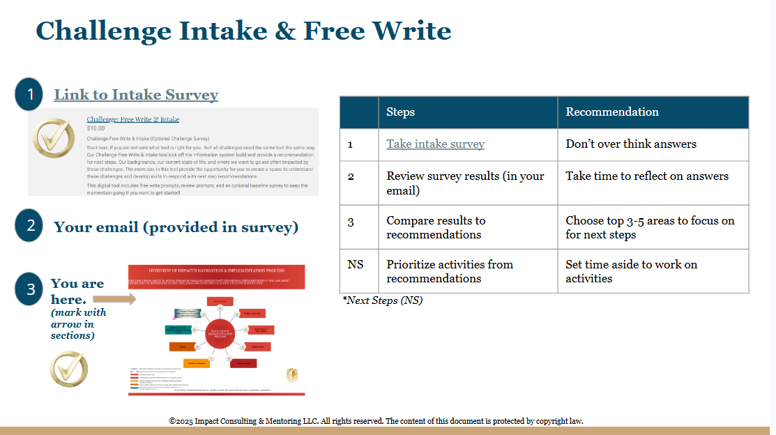 Try our Challenge Intake & Freewrite. The prompts will help you get started or you can just dive right into the survey. It is a choose your own adventure based on the time set aside and your desire to learn.